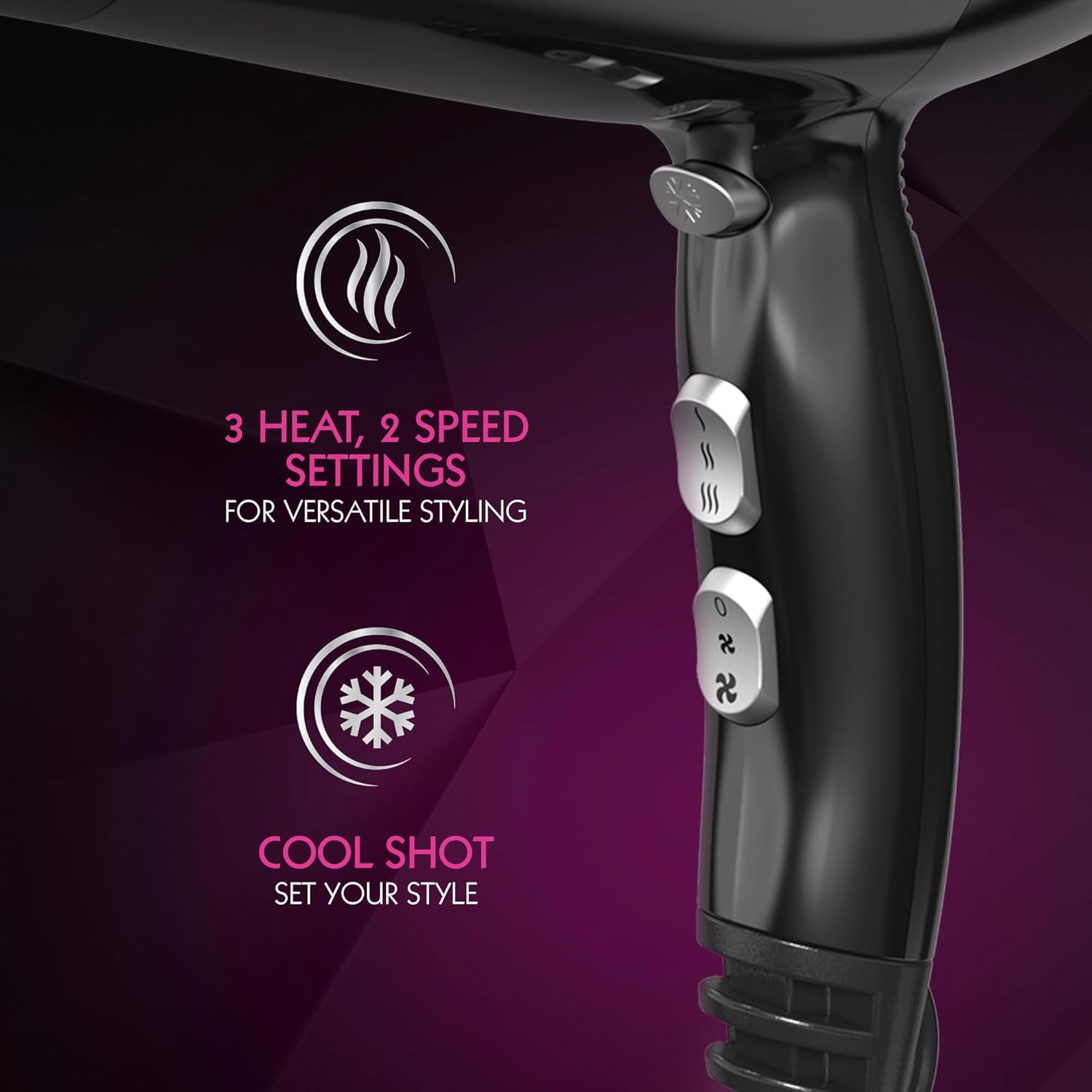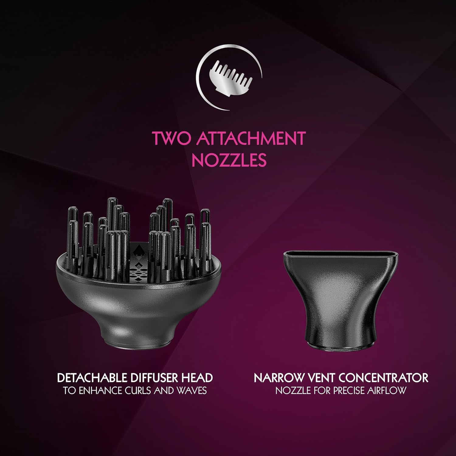 - Narrow vent concentrator nozzle for precise airflow and a detachable diffuser head to enhance curls and waves.