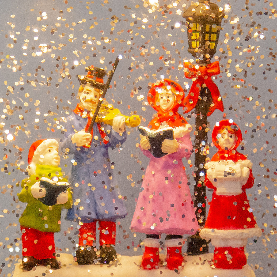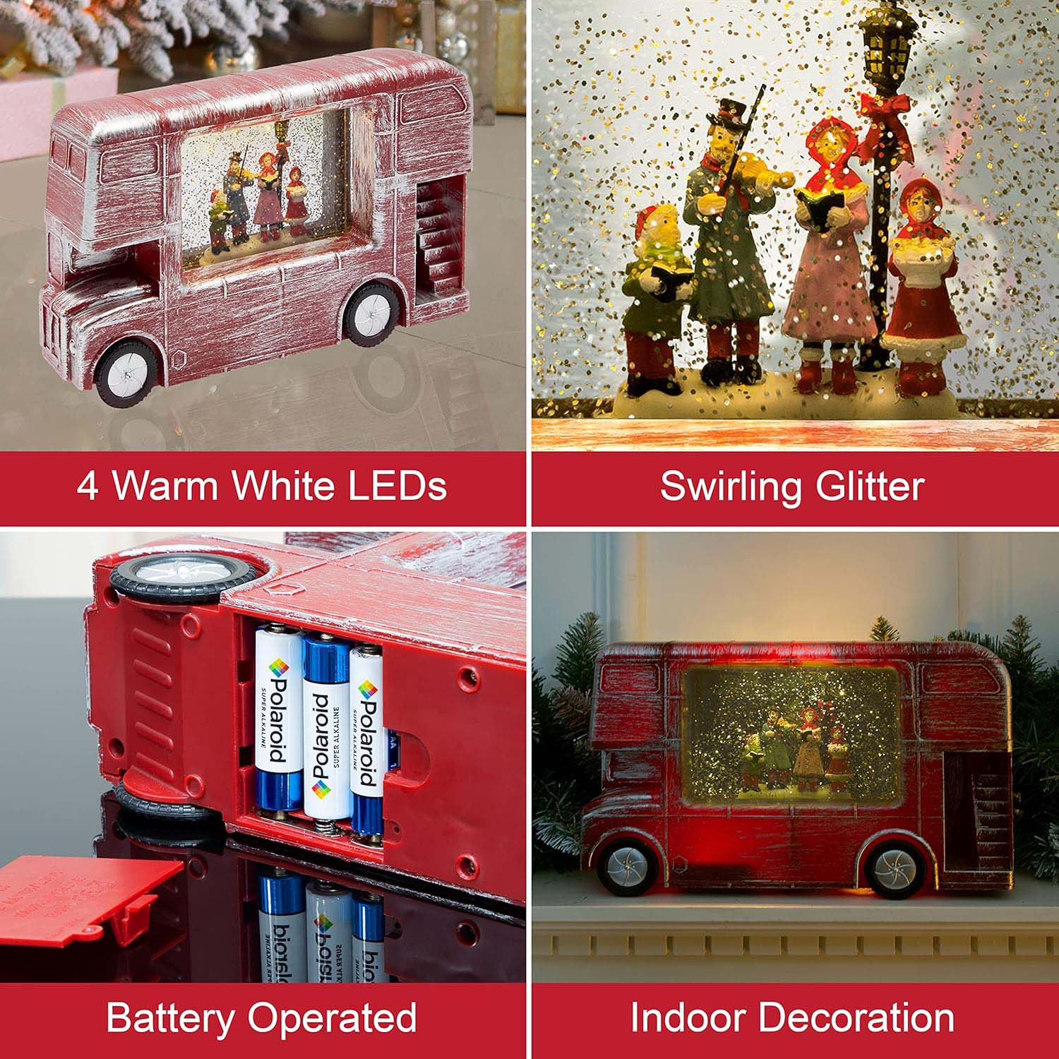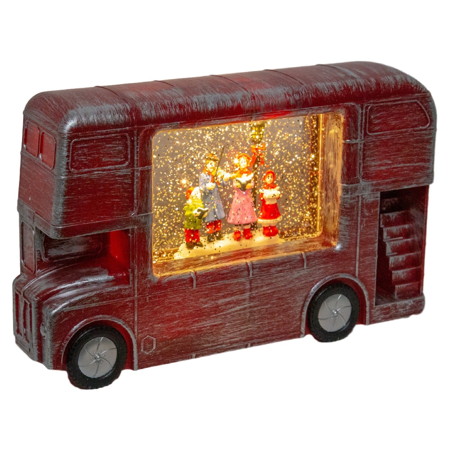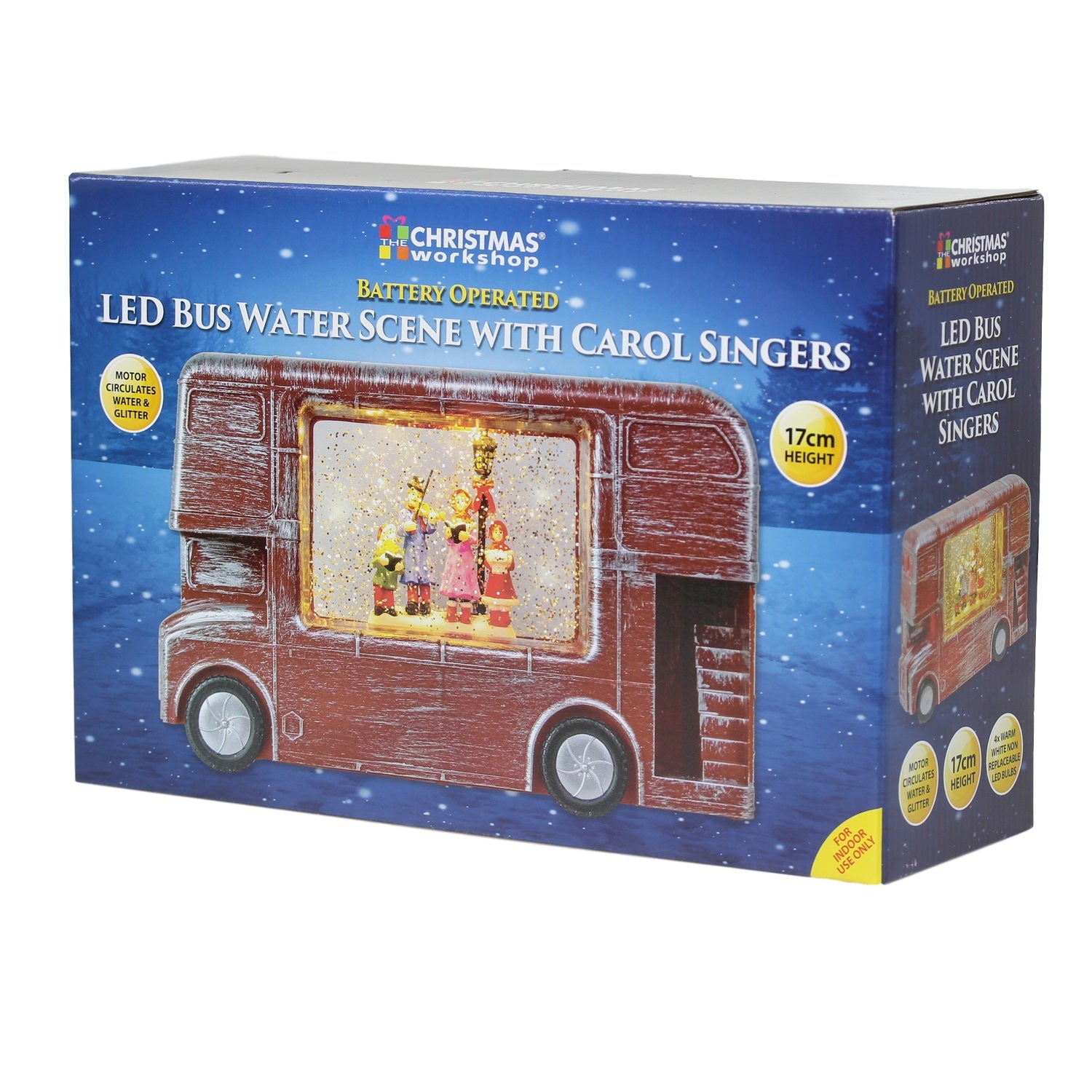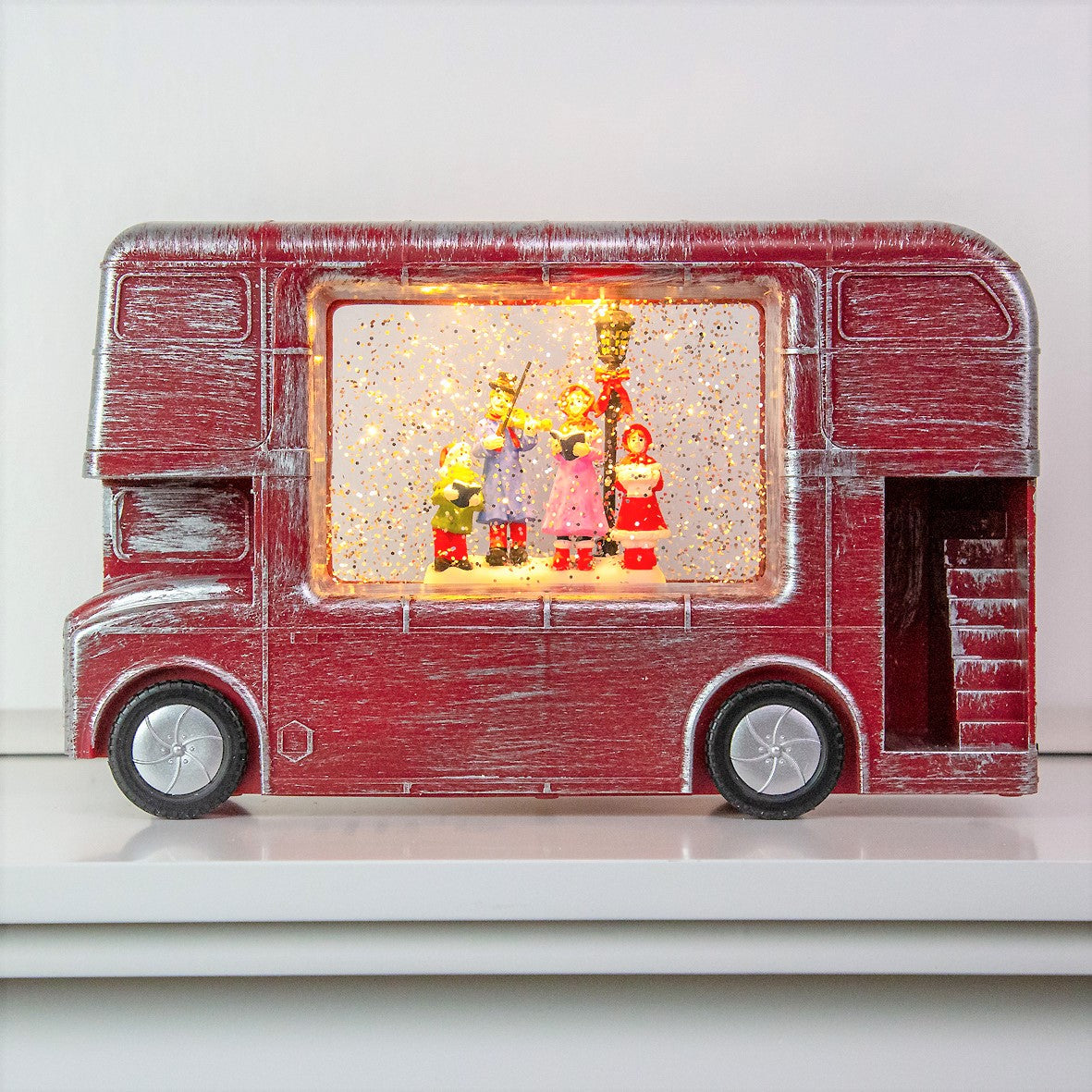This unique light-up water-filled Christmas ornament featuring a choir singing inside a London bus is the perfect Christmas decoration to sit on top of the fireplace or on the window sill to bring that additional cheer to the family. Bring some grandeur and a striking focal point to your home this Christmas and for many more Christmases to come! Features 4 warm LED light bulbs that illuminate the inside of the London bus. The lights are powered by 3x AA batteries (not included) or can be powered through the mains via a 5V 300mA adapter (again not included). Approx. Product Dimensions: 28 x 7 x 17 cm.