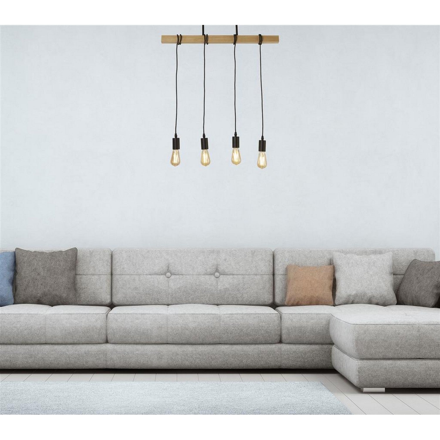 The Woody 4 light ceiling bar pendant fuses on trend barn house and industrial styles to create a stunning centre piece to any dining or living room. The wood bar descends from a matt black metal ceiling fixture, with 4 exposed bulbs illuminating the room with a contemporary style.
