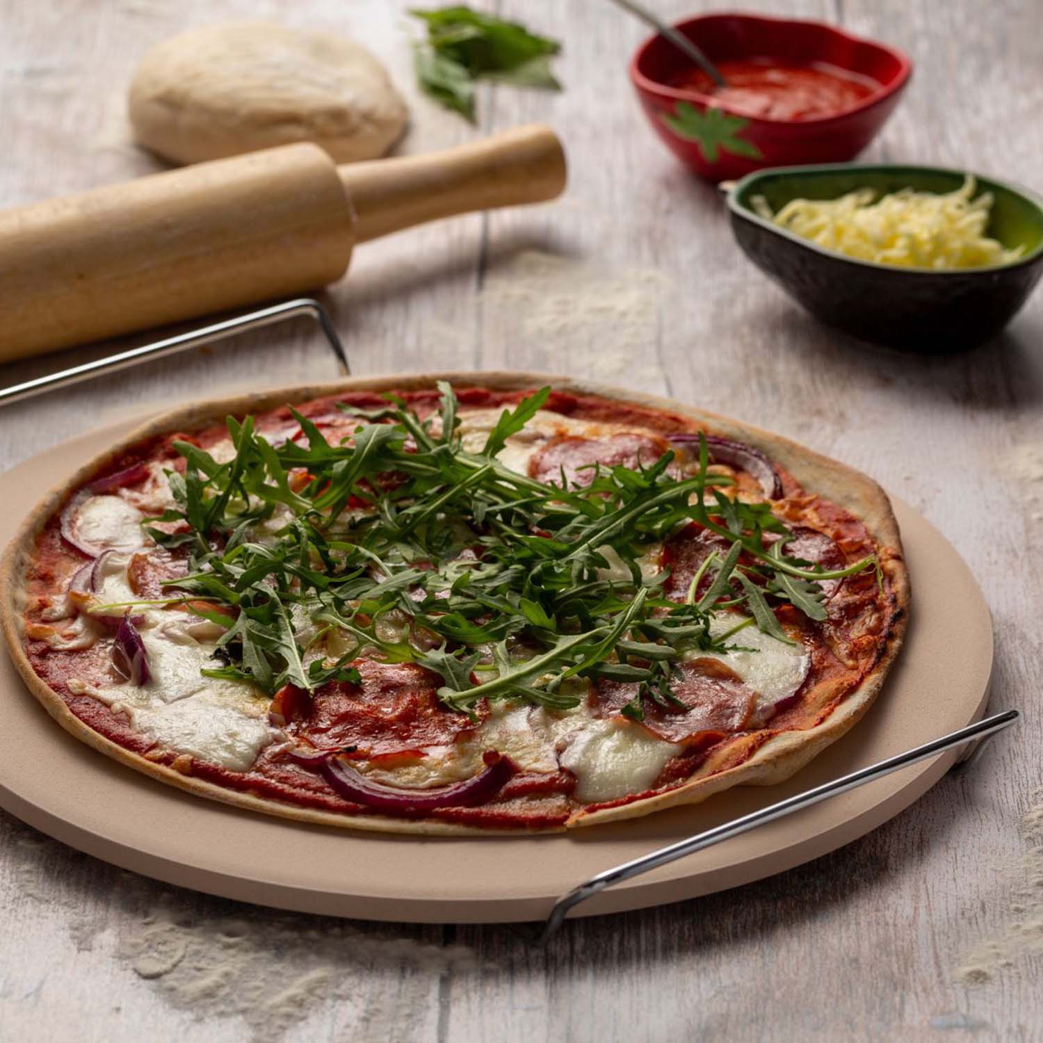 Elevate your homemade pizza game with our World Foods 33cm Pizza Stone. Crafted from premium ceramic, this stone ensures even heat distribution for perfectly crispy crusts every time. Complete with a sleek chrome rack for easy serving straight from the oven, convenience is at your fingertips. Microwave, dishwasher, freezer, and conventional oven safe, this pizza stone is a must-have for any kitchen.