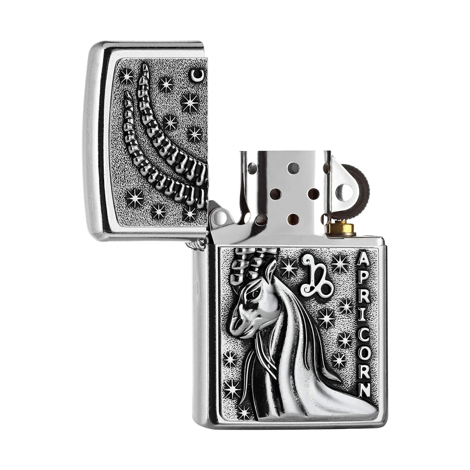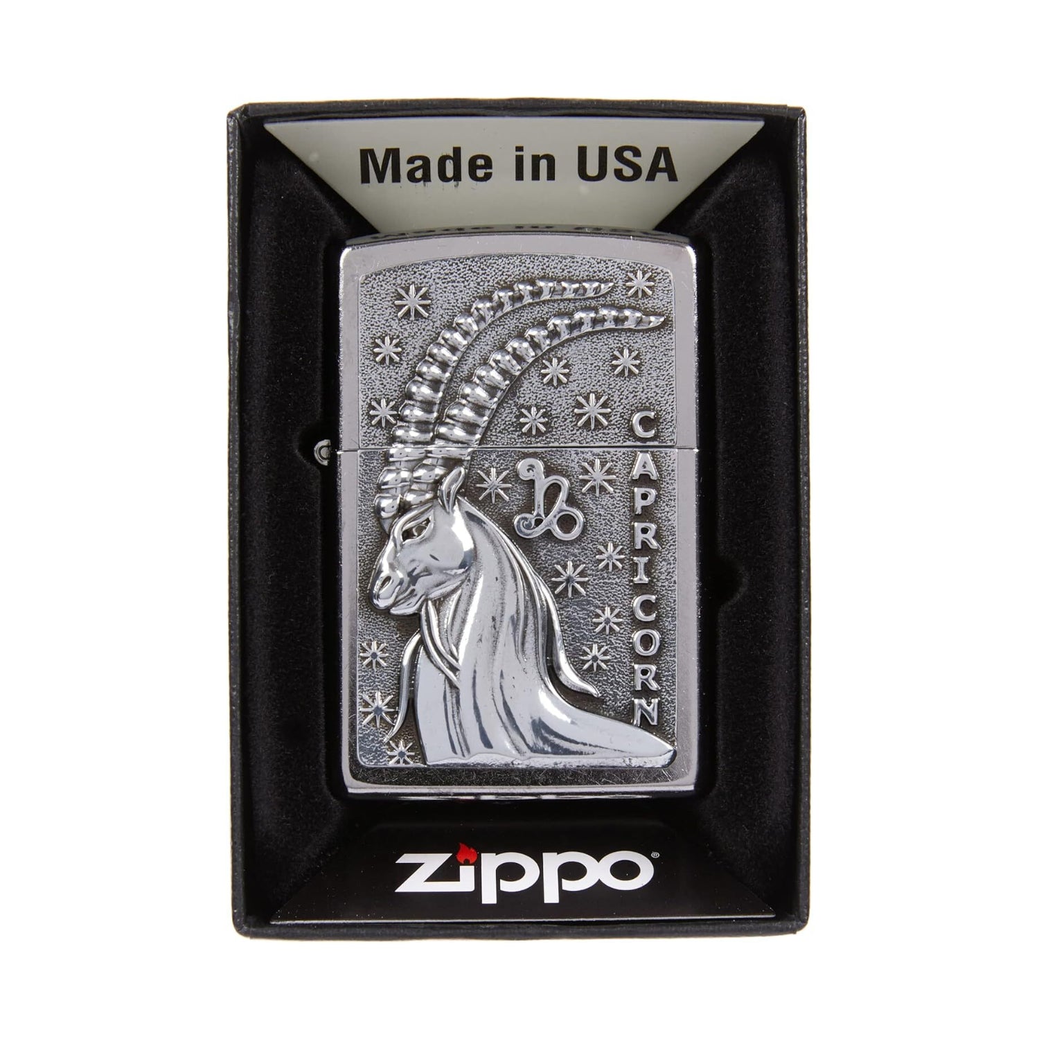 The Zodiac sign of Capricorn is one of the twelve signs of the Zodiac. A detailed star-lit Emblem design on a Street Chrome Windproof Zippo lighter. Comes packaged in a gift box. For optimal performance fill with Zippo lighter fuel.